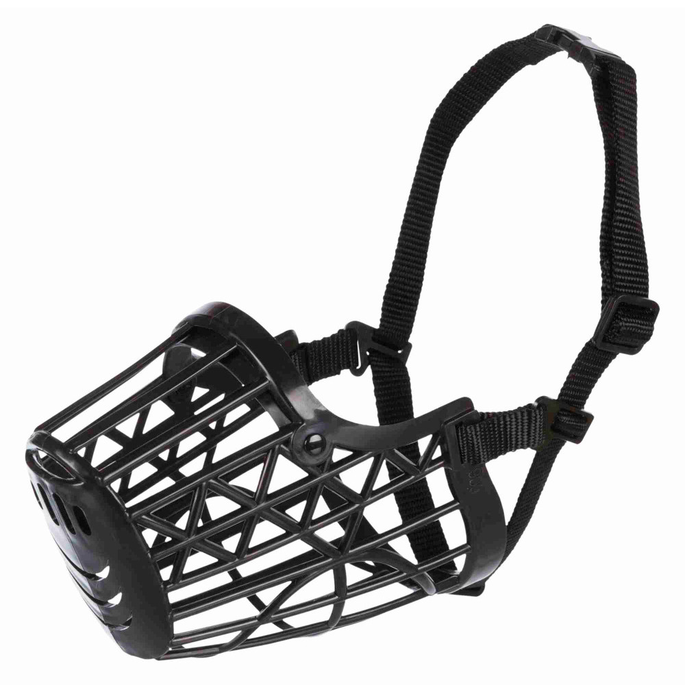 Este açaime feito de plástico é fornecido com uma tira em pele que permite um ajuste perfeito ao focinho do animal.