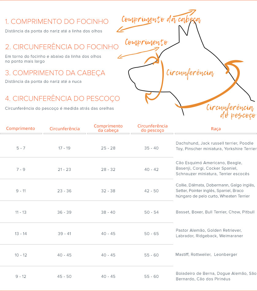 Nota: as indicações acimas são meras recomendações. O tamanho do açaime deve ser verificado segundo as medidas do focinho e cabeça do cão.