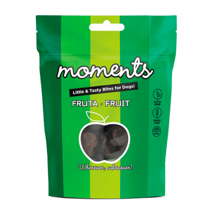 Moments Cão - Fruta são petiscos fantásticos com formas e sabores divertidos. Além disso, eles são lanches muito saudáveis para o seu animal de estimação, uma vez que são ricos em DHA, livres de grãos e livres de transgênicos.