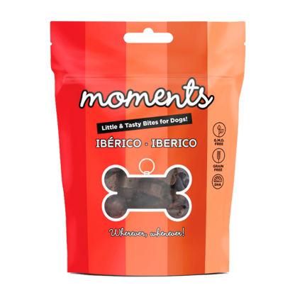 Moments Cão - Ibérico são petiscos fantásticos com formas e sabores divertidos. Além disso, eles são lanches muito saudáveis para o seu animal de estimação, uma vez que são ricos em DHA, livres de grãos e livres de transgênicos.