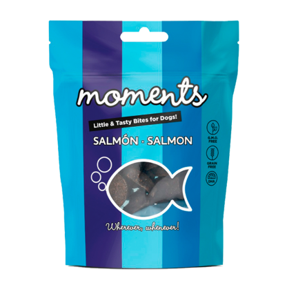 Moments Cão - Salmão são petiscos fantásticos com formas e sabores divertidos. Além disso, eles são lanches muito saudáveis para o seu animal de estimação, uma vez que são ricos em DHA, livres de grãos e livres de transgênicos.