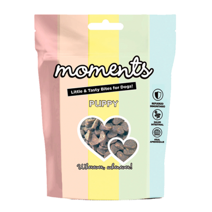 Moments Puppy são petiscos fantásticos com formas e sabores divertidos. Além disso, eles são lanches muito saudáveis para o seu animal de estimação, uma vez que são ricos em DHA, livres de grãos e livres de transgênicos.